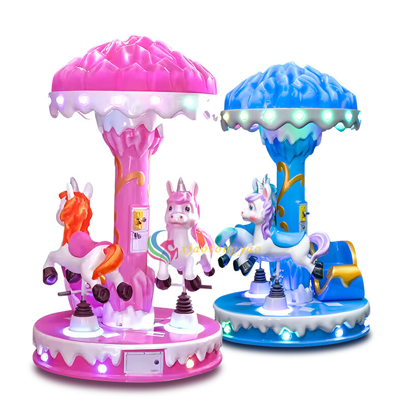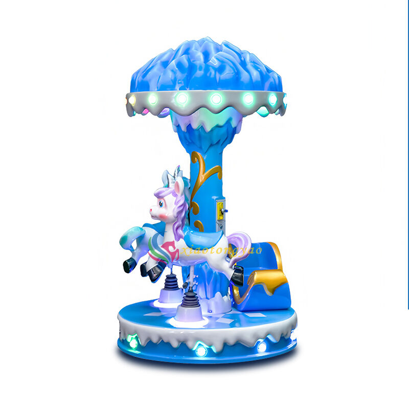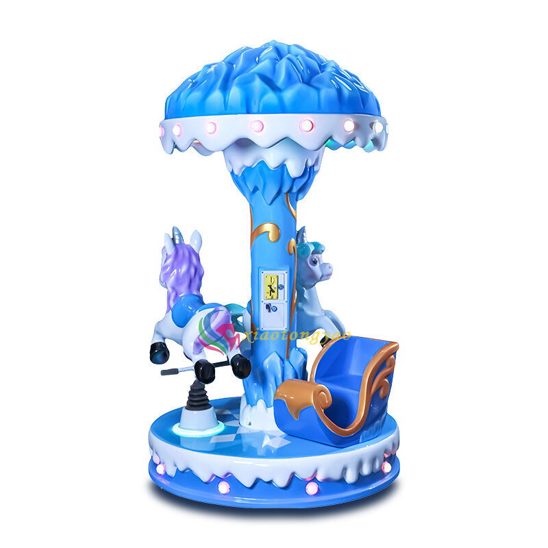 This is a three seater mini carousel specially designed for young children, with the core theme of "Ice and Snow Unicorn". It perfectly blends the dreamy ice crystal canopy with the cute unicorn shape to create a miniature ice and snow fairy tale amusement park. The whole machine adopts a pink and blue dual color optional design, combined with a round and safe cabin and soft lighting and sound effects, which can meet the interactive needs of parent-child ride and friend companionship, and allow children to immerse themselves in the romance and joy of the fairy tale world in the soothing and undulating rotation. It is a popular children's playground equipment that attracts attention in shopping malls, amusement parks, and parent-child halls.