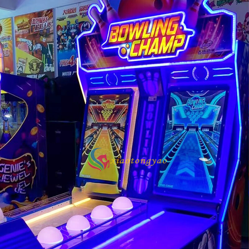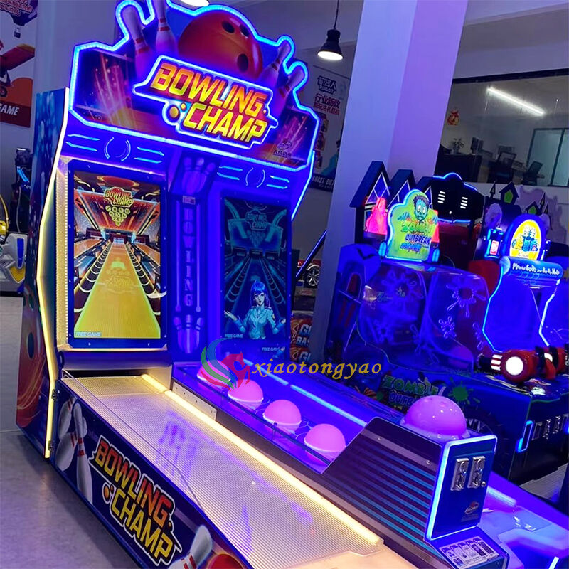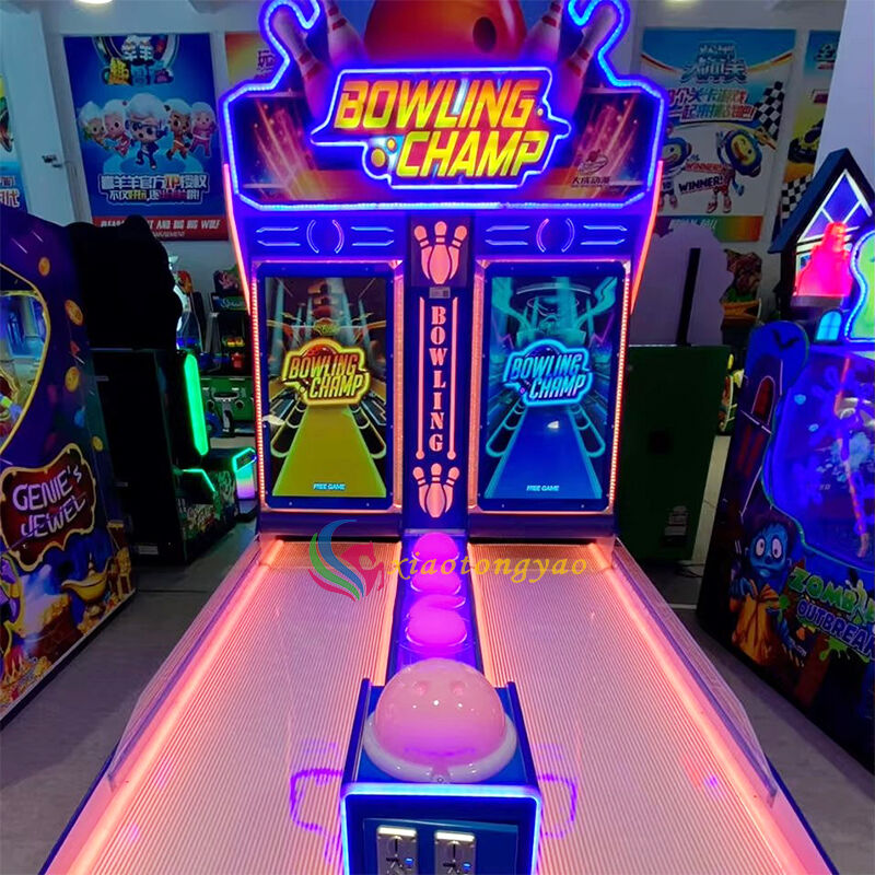 This is a two player linked bowling game console designed specifically for gaming arcades and game halls, with the theme of "BOWLING CHAMP". It features a dual track design and colorful lighting effects, paired with dual high-definition screens and an intelligent scoring system, to recreate the real thrill of bowling. Supporting two player competitive PK, easy to operate and suitable for players of all ages, it is a popular and popular device for attracting customers and increasing venue revenue.