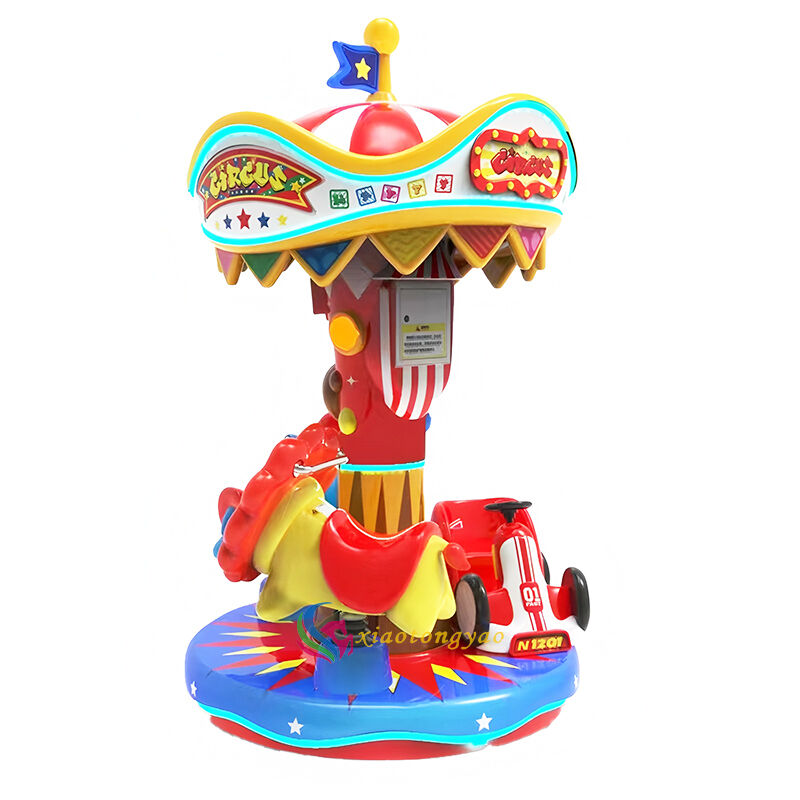 This three person carousel is designed with circus carnival as its core inspiration and is a small parent-child amusement device specifically designed for young children. It combines cute animal shapes with classic horse riding experiences, with 3 independent seats to meet the needs of parent-child or group play. It runs smoothly, safely and comfortably, and can become an eye-catching check-in point for children's playgrounds and mall courtyards, as well as efficiently increase venue revenue.