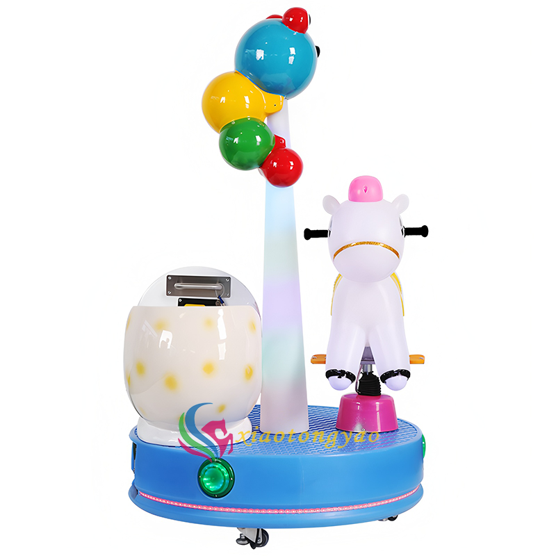 This is a two seater rotating rocking bike designed specifically for young children, with the core design of "Rainbow Pony+Cute Eggshell", integrating soft rotation, gentle swinging, colorful lighting, and fun sound effects. The dual seat design supports parent-child or partner travel, with a smooth and safe cabin structure that allows children to experience joy in a dreamy atmosphere while exercising balance and social skills. It is a popular attraction for shopping malls, children's playgrounds, and maternity and baby stores.