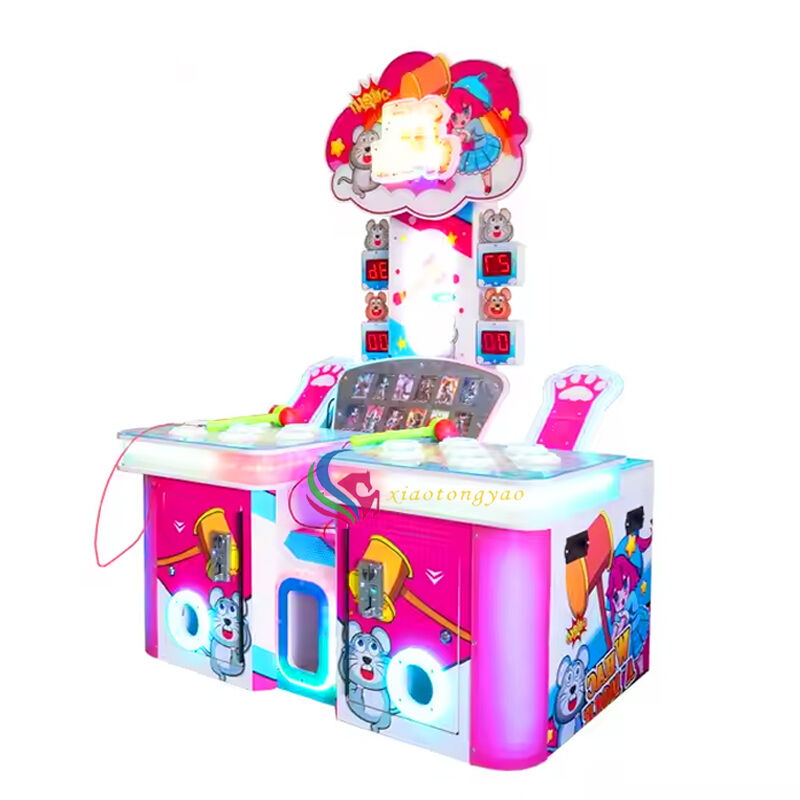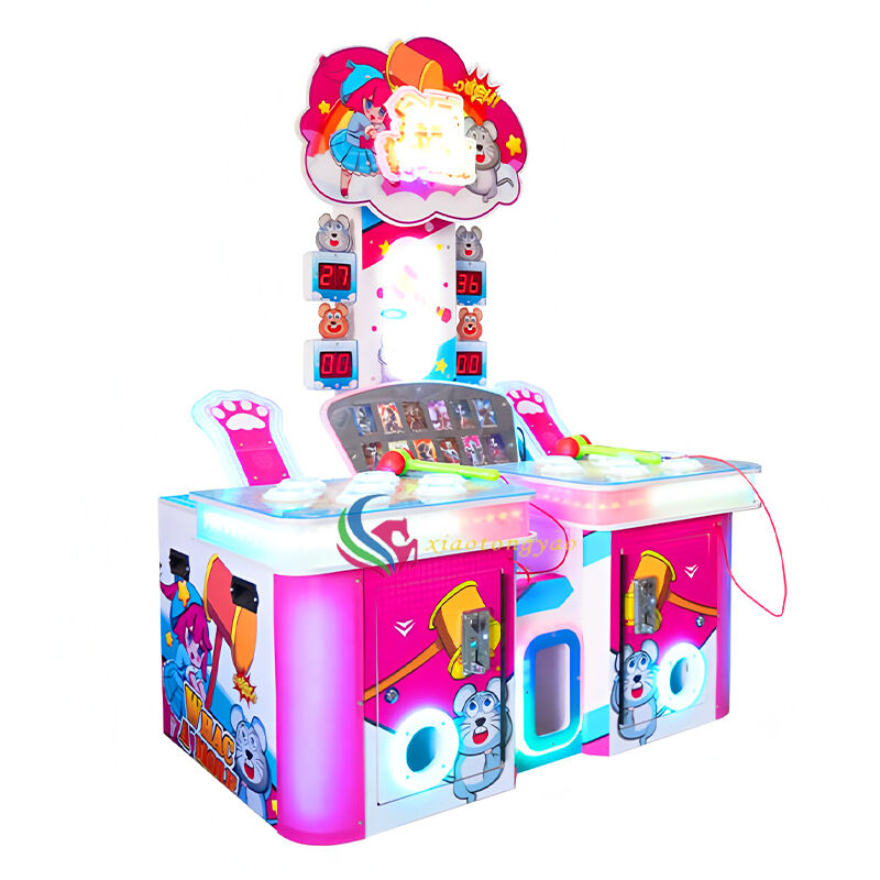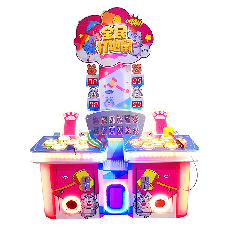 A fun tapping game console created by two person interaction, with the theme of "National Ground Mouse Strike", adopting a pink blue contrasting childlike appearance and cartoon element design, paired with dual consoles and electronic scoring system, allowing players to exercise their reaction and hand eye coordination skills in joyful tapping. The device supports dual player competition, which is suitable for parent-child interaction, friend battles, and can also become a popular and eye-catching device in shopping malls, parent-child amusement parks, and video game cities, bringing players an immersive entertainment experience of easy decompression.