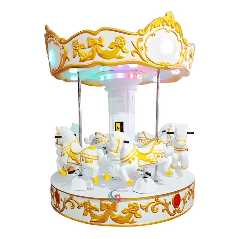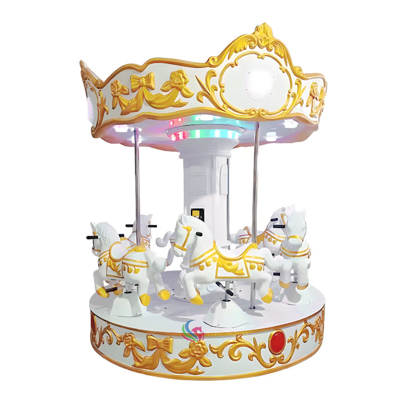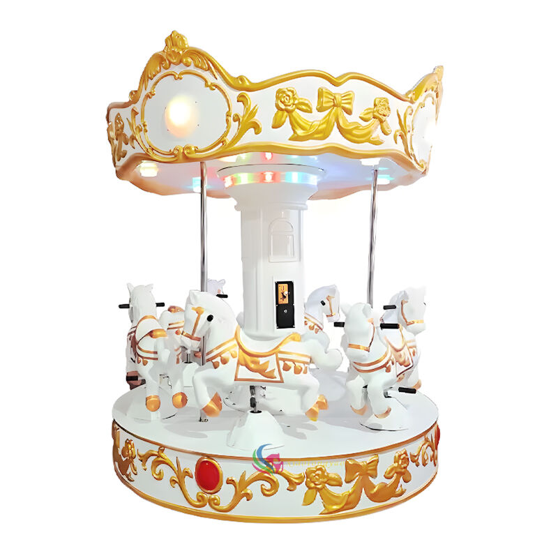 This is a small six person carousel designed specifically for children and parent-child families, with European court aesthetics as the design core. The platinum color scheme is matched with exquisite carved decorations, restoring the romantic atmosphere of fairy tales. The device is compact in size and runs smoothly, suitable for indoor scenes such as children's playgrounds, mall courtyards, and parent-child restaurants. It is a popular amusement equipment that creates a dreamy atmosphere and attracts family customers.