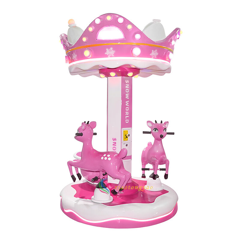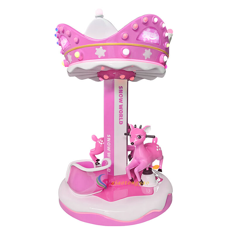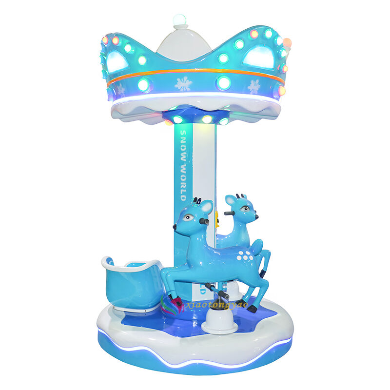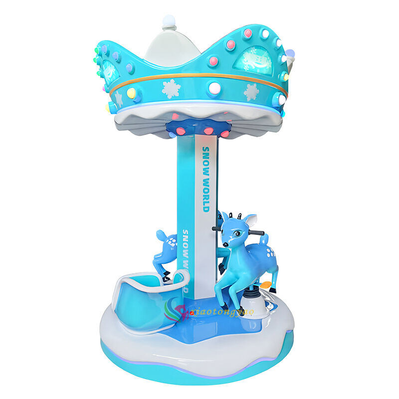This three person carousel features an ice and snow world as its core theme and is a small parent-child amusement device designed specifically for young children. The overall color scheme adopts a fresh blue and white color scheme, paired with cute and playful deer seats and snowflake decorations, restoring the winter snow scene atmosphere. Three independent seats meet the needs of parents and children traveling together or playing with friends, running smoothly and leisurely. It can become an eye-catching check-in point for children's playgrounds and mall courtyards, and also efficiently increase venue revenue.