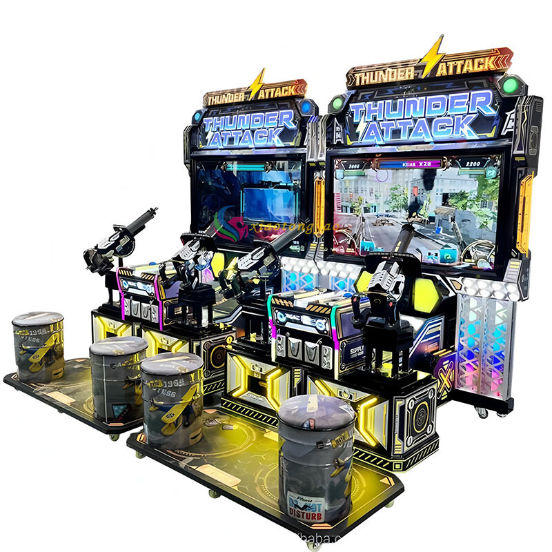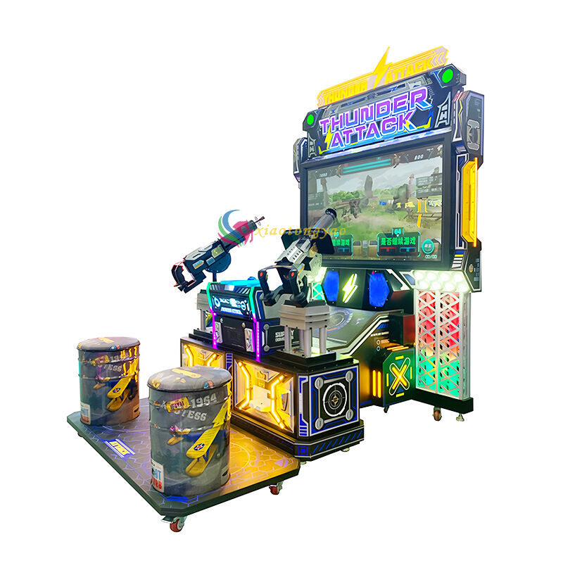 This' Thunder Raid 'two player shooting game console is an immersive competitive amusement equipment designed specifically for gaming arcades and amusement parks. The body adopts a cyberpunk style metallic texture and colorful lighting design, paired with a dual gun position and exclusive seat layout for two person battles, perfectly adapting to multi person interactions such as parent-child, friends, and couples. The device is equipped with a high-definition large screen and stunning sound effects, restoring the real battlefield atmosphere. Players can hold a simulated gun handle for precise shooting and pass levels, supporting two person collaborative combat or competitive PK. The operation is smooth and easy to use, which can meet the hardcore experience of shooting enthusiasts and quickly attract customers through high interactivity. It is a core tool for venue drainage and revenue enhancement.